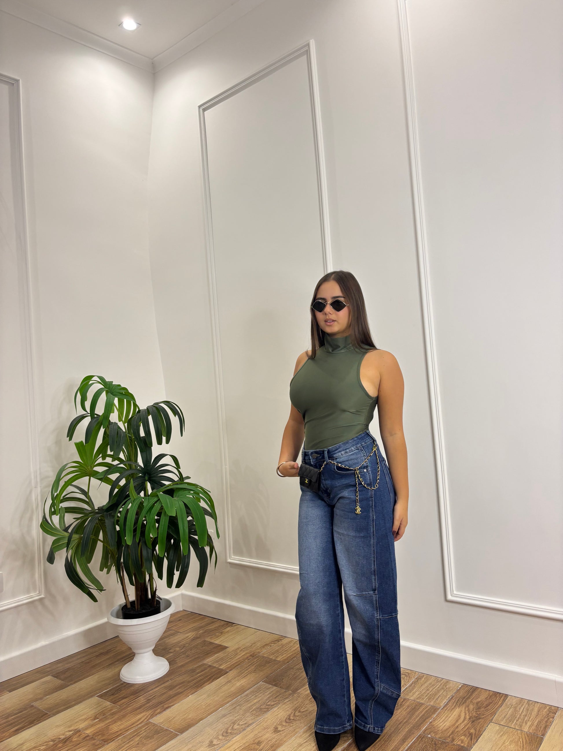Body verde militare in tessuto elasticizzato, senza maniche e con collo alto. Presenta una vestibilità aderente